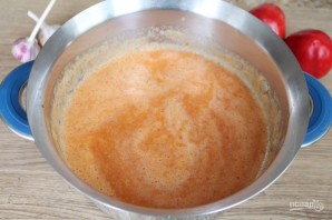 Помидоры моем, режем крупно и пропускаем через мясорубку с чесноком и острым перцем. Томат ставим на огонь.