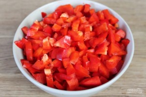 Красный перец режем кусочками и высыпаем в кипящий томат.