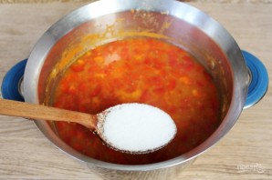 В аджику добавляем соль и сахар. Варится аджика, примерно, 20 минут. Периодически ее нужно помешивать.