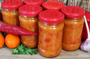Заготовка на зиму в домашних условиях. Для приготовления вкусной аджики выбираем самые спелые и сладкие помидоры. Кусочки красного перца не только украсят аджику, но и придадут ей интересный вкус Заготовка готова к хранению на зиму.