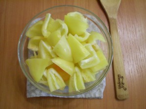 У перца отрезаем хвостики, удаляем семена. Нарезаем его.