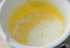 Смешайте яйца с сахаром и кефиром. Добавьте соду и муку.