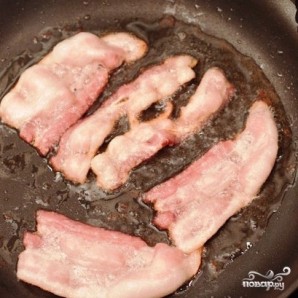 Ломтики бекона или кусочки сала с прожилкой обжариваем на сковороде до состояния шкварок.