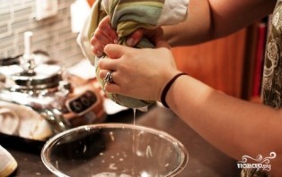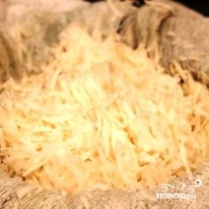 Далее картофель нужно либо натереть на терке, либо измельчить при помощи кухонного комбайна. Я предпочитаю второе :) Тертый картофель кладем в марлю.