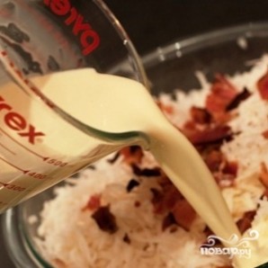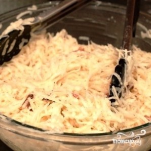 Смешиваем отжатый тертый картофель, шкварки, молоко, сметану и яйца. Солим и перчим по вкусу.
