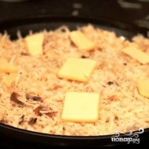 Получившуюся массу перекладываем в форму для запекания. Сверху кладем несколько ломтиков сливочного масла.