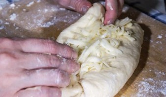5. В каждый кусок теста распределяем часть сыра, как бы заматывая его в тесто.