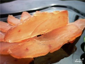 Достаньте балык из холодильника и разрежьте на тонкие кусочки. Хранить балык лучше в холодильнике, в марле или льняной салфетке.