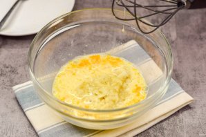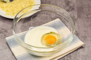 В отдельную миску вбейте куриное яйцо, добавьте молоко, сахар и щепотку соли.