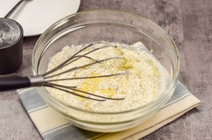 Теперь всыпьте в миску овсяную муку и разрыхлитель теста.