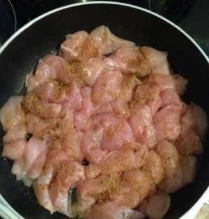 Нарезаем кубиками куриное филе. Затем обжариваем 5 минут на растительном масле, посолив и поперчив.
