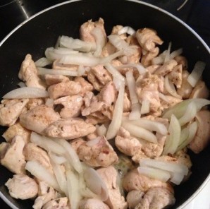 Добавляем к курице лук, порезанный полукольцами. Готовим до прозрачности.