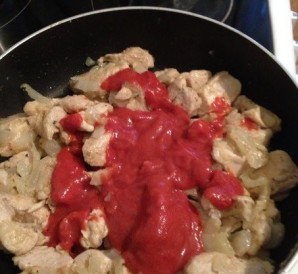 Теперь добавляем муку и томатный соус, тщательно все перемешиваем.