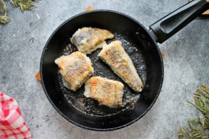 В сковороду налейте растительное масло и разогрейте на среднем огне. Рыбу посолите, поперчите и обваляйте в муке. Выложите рыбу и обжарьте с двух сторон до готовности. Переложите рыбу в тарелку и накройте крышкой.