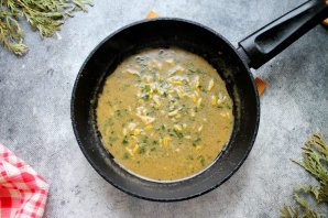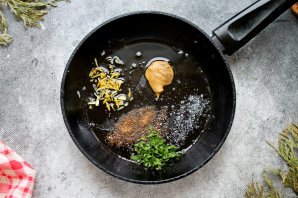 В сковороду после обжаривания выложите горчицу, цедру лимона, молотый кориандр. Кинзу мелко порежьте, положите в сковороду, посолите, поперчите и перемешайте.