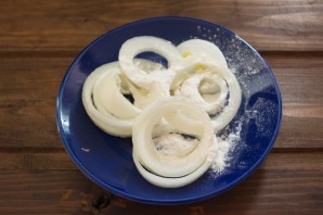 Репчатый лук нарезать полукольцами. Присыпать 2 ст. ложками муки. Перемешать. Мука должна прилипнуть к луку.