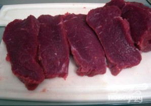 1. Вначале выбираем для нашего блюда хорошее мясо, после того как мясо выбрали, его нужно приготовить к обжариванию. Отделяем мясо от жил, и промываем в воде. Теперь нарезаем мясо на стейки (обязательно поперек волокон), каждый кусок надо смазать растительным маслом, поперчить и посолить. Затем, на сильно разогретую и сухую сковороду выкладываем мясо, и начинаем его обжаривать. Сверху оно должно поджариться, а внутри остаться розовым. Обжариваем приблизительно минут десять.