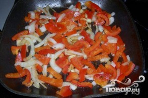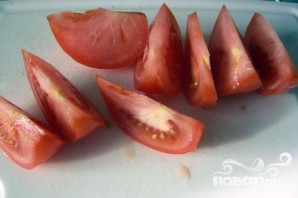 3. Теперь следует заняться овощами. Берем несколько помидоров, помоем их, порежем на дольки, и добавим их к другим овощам, на сковороде протушим все приблизительно минут пять. Овощи должны стать слегка мягкими.