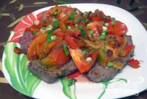 4. Бифштекс выложим на тарелку, овощи ложем сверху на мясо, все это хорошо украшаем зеленью и подаем к столу