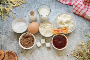 Подготовьте все необходимые ингредиенты для приготовления бисквитного рулета со сливочным сыром. Муку смешайте с какао порошком, яйца разделите на белки и желтки.