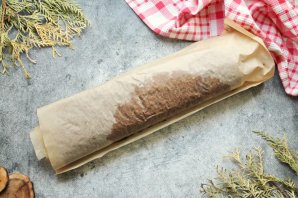 Готовый бисквит снимите с противня, переверните на чистый лист пергамента и снимите нижний, на котором выпекался. Сверните бисквит вместе с пергаментом в рулет и полностью остудите.