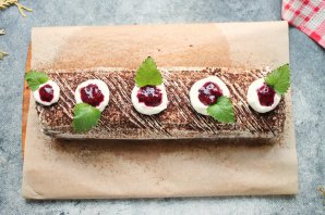 Смажьте верх рулета кремом и посыпьте какао. Уберите в холодильник на 2-3 часа. Вилкой сделайте бороздки и украсьте кремом, вареньем и листочками мяты или по своему желанию.