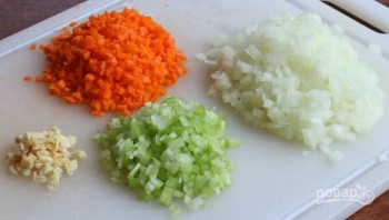 1. Промойте, почистите и мелко нарежьте морковь, сельдерей, лук, чеснок.