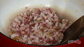 2. Нарежьте бекон небольшими кусочками. Нагрейте кастрюлю, отправьте в нее бекон и обжаривайте до полной готовности на среднем огне.