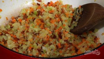 3. Добавьте овощи к бекону и готовьте 5-7 минут, пока они не станут мягкими.