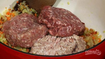 4. Положите в кастрюлю говяжий, телячий и свиной фарш, готовьте пока мясо не приобретет золотистый оттенок.