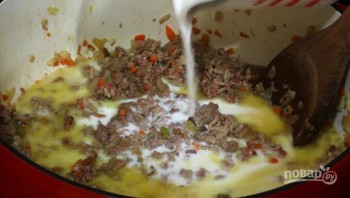 5. Влейте молоко, доведите до кипения, уменьшите огонь до минимума, накройте крышкой и готовьте 1 час.