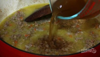 6. Влейте в кастрюлю говяжий бульон, красное и белое вино.