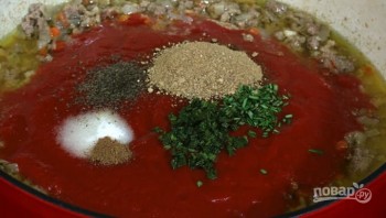7. Добавьте томатный соус, соль, перец, лавровый лист, розмарин, мускатный орех и шалфей.