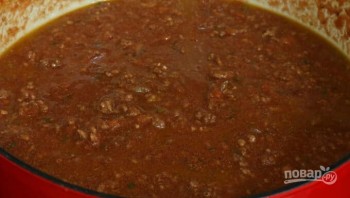 8. Доведите соус до кипения, затем уменьшите огонь до минимума, накройте крышкой и тушите в течение 2 часов. Соус должен стать густым, если он все же будет жидким, снимите крышку и кипятите 25-30 минут. Промойте и измельчите петрушку, добавьте ее в кастрюлю, посолите и поперчите по вкусу.