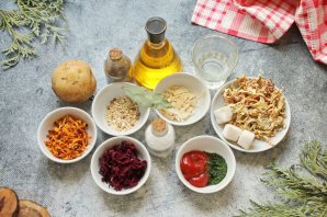 Подготовьте все необходимые ингредиенты для приготовления борща с сушеными овощами. Картофель будем использовать свежий.
