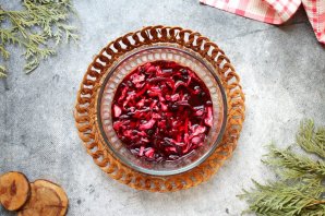 В чашку выложите сушеную капусту и свеклу. Залейте овощи 200 миллилитрами теплой воды и оставьте на четыре часа при комнатной температуре.