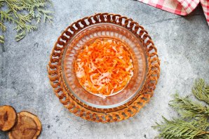 В чашку выложите сушеные морковь и репчатый лук. Залейте овощи 100 миллилитрами теплой воды и оставьте на четыре часа на кухонном столе.