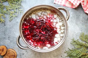 Вылейте в кастрюлю бульон и свеклу с капустой вместе с водой. Слейте воду с моркови с луком и поставьте на средний огонь. Доведите все до кипения, посолите, варите в течение 15-20 минут.
