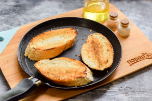 Сковороду прогрейте и смажьте растительным маслом. Выложите ломтики багета и поджарьте с каждой стороны по несколько минут, до румяности.