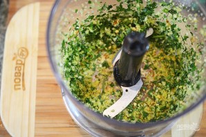 Сначала сделаем соус песто. В чашу блендера положите все ингредиенты для песто, кроме масла и соли. Измельчите.
