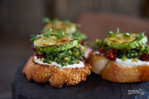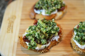 Рецепт не отнимет много времени. Брускетта — закуска очень универсальная, т.к. за основу здесь берутся ломтики обжаренного хлеба, на которые выкладываются разного вида начинки. У нас брускетта с настоящими итальянским начинками: вялеными помидорами и соусом "Песто". Да и соус мы приготовим сами из орехов, зелени и пармезана с оливковым маслом. Очень вкусно, полезно и достаточно просто Закуска готова. Подавайте сразу.