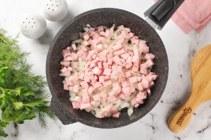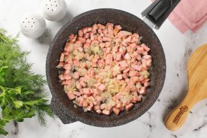 Разогрейте сковороду и налейте масло. Выложите нарезанные кубиками лук и колбасу.