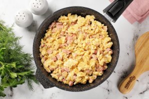 Лопаткой или ложкой перемешайте содержимое. Жарьте около одной минуты, в процессе приподнимая отдельные участки и переворачивая их, чтобы яйца запеклись.