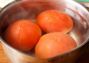 Помидоры надрежьте крест накрест и обдайте кипятком.