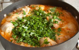 В конце добавляем рубленный чеснок, зелень, перец и специи. Перемешиваем, тушим еще 5-7 минут.