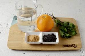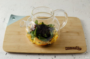 Выложите в заварочный чайник нарезанный апельсин и мяту.