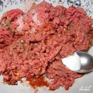 Добавляем в получившийся фарш специи, соль, перец, соду. Хорошенько вымешиваем.