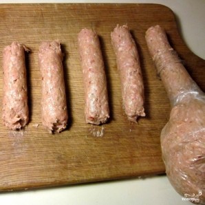 Теперь - маленькая сербская хитрость. Сделаем следующее приспособление: отрежем горлышко пластмассовой бутылки и прикрепим к нему полиэтиленовый пакет с приготовленным нами фаршем. Затем выдавливаем через горлышко вот такие сосиски из фарша.