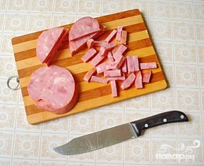 3. Толстой соломкой нарезаем рубленую ветчину. Жареная или вареная свинина может легко подойти вместо ветчины. Так же подойдет копченая грудинка, колбаса или курица.