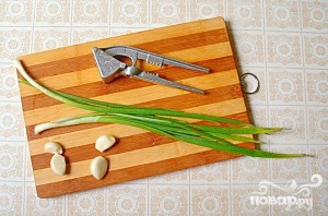 4. Через давилку пропускаем чеснок, и нарезаем совсем немного зеленого лука.